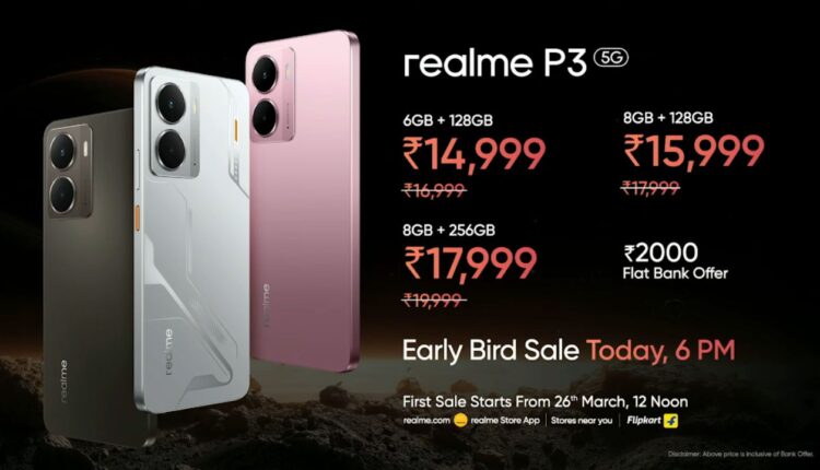 రియల్మీ P3 5G, రియల్మీ P3 అల్ట్రా 5G స్మార్ట్ఫోన్ గేమింగ్, మల్టీ టాస్కింగ్ ఇంకా ఎంటర్టైన్మెంట్ అవసరాలను దృష్టిలో పెట్టుకుని విడుదల చేసారు. ఇది మూడు వేరియంట్లలో లభ్యమవుతోంది. నేడు (మార్చి 19)న జరిగిన ఎర్లీ బర్డ్ సేల్లో రియల్మీ P3 5G కొనుగోలు చేసిన వారికి ఆకర్షణీయమైన ఆఫర్లు అందుబాటులో ఉన్నాయి. లాంచ్ ఆఫర్ కింద బేస్ వేరియంట్ కేవలం రూ.14,999కే అందుబాటులో ఉంది. అదనంగా, బ్యాంక్ ఆఫర్ల ద్వారా రూ.2,000 వరకు తగ్గింపు లభిస్తుంది. స్పేస్ సిల్వర్, కామెట్ గ్రే, నెబ్యులా పింక్ రంగులలో ఈ మొబైల్ అందుబాటులో ఉంది. ఇక 6GB RAM + 128GB స్టోరేజ్ రూ.16,999, 8GB RAM + 128GB స్టోరేజ్ రూ.17,999 , 8GB RAM + 256GB స్టోరేజ్ రూ.19,999 గా ధరలు నిర్ణయించబడ్డాయి.
